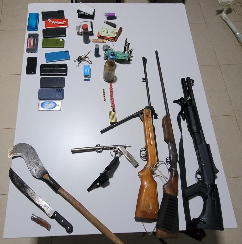 Com o grupo também foram apreendidas quatro armas de fogo, um facão, uma foice, diversas munições, aparelhos celulares e petrechos de recarga.
