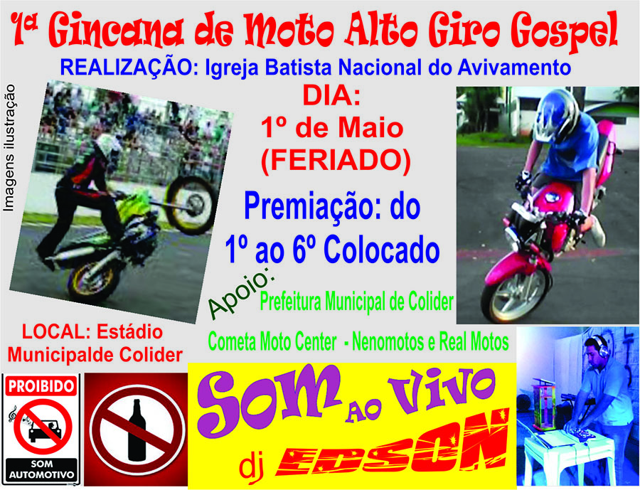 No FERIADO de 1º de MAIO, Dia do Trabalhador, em Colider acontecerá a “Primeira Gincana de Motos Alto Giro Gospel”, realização da Igreja BATISTA NACIONAL DO AVIVAMENTO Com Apoio da Prefeitura Municipal de Colider. Será no Ginásio Municipal, e contará com Premiação em, Dinheiro, troféus e acessórios para Motos. Abrilhantando o evento estará o DJ Edson com som ao vivo.Â