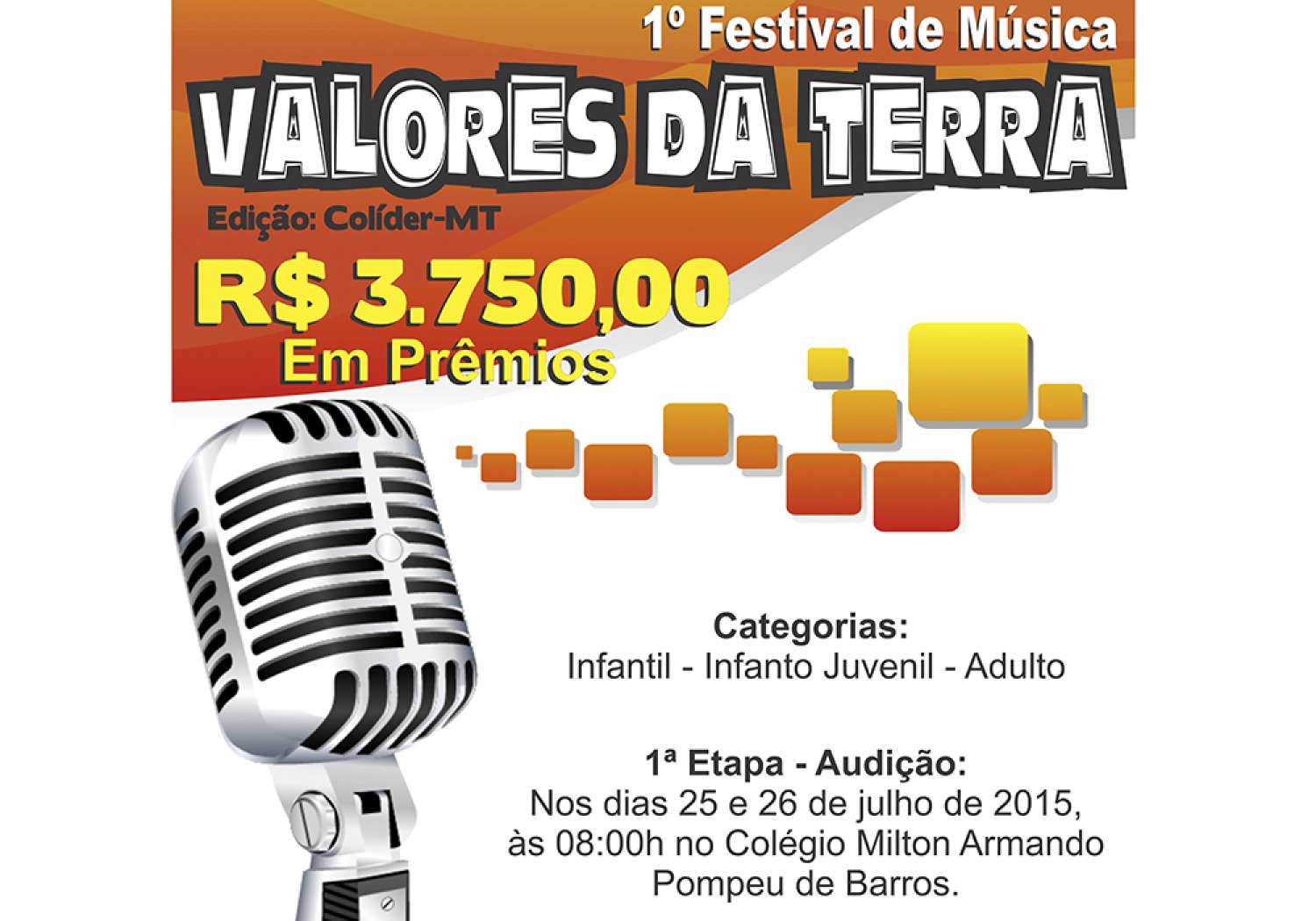 Encerrou-se  a 27ª EXPOLÃŒDER, e a comissão organizadora do 1º Festival Valores da Terra mobiliza Colíder para o evento a ser realizado no dia 12 de setembro, na Praça Central, em Colíder, mais de 70 participantes já está inscritos e estima-se que calouros e amadores  de todo norte  de Mato Grosso estarão em Colíder para vivenciar o Festival Valores da Terra. O evento, que é organizado pela Associação dos Moradores e Amigos de Colíder – AMAC acontece pela primeira vez, todavia é um projeto que prevê o futuro e é um momento de reunião e partilha de  participantes cantores diversos, não apenas da classe estudantil, mas também de calouros e amadores de todas as categorias.