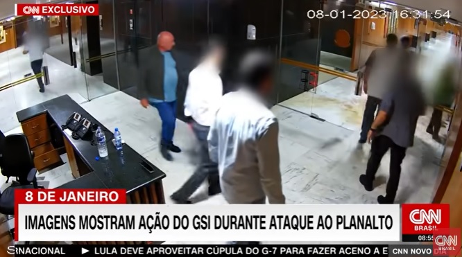 Ainda segundo a CNN, os vídeos mostram que, em vários momentos, funcionários do GSI e invasores circularam no Palácio do Planalto. No terceiro andar, onde as câmeras registraram as imagens do ministro, diversas pessoas quebraram câmeras de segurança, mesas de vidro e o relógio Balthazar Martinot, que chegou ao Brasil pelas mãos de dom João VI em 1808.
