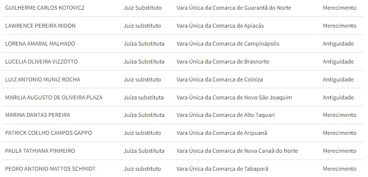 Da lista, o único que já estava lotado como titular era o juiz Fernando Kendi Ishikawa. O magistrado estava na 2ª Vara de Peixoto de Azevedo e foi promovido por antiguidade para a 2ª Vara de Juara.