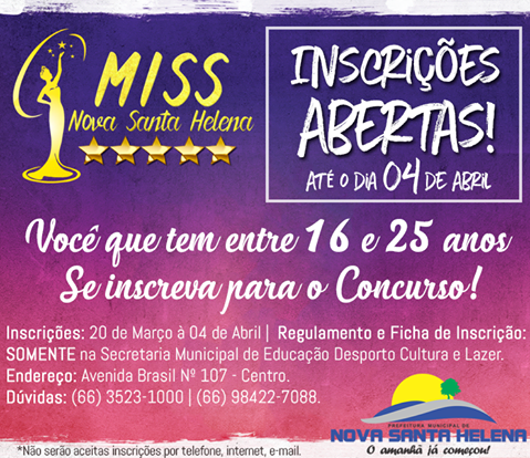 O concurso Miss Nova Santa Helena 2017 estará com inscrições abertas do dia 20 de Março a 04 de abril. As interessadas em participar devem comparecer à Secretaria Municipal de Educação, Desporto, Cultura e Lazer. Com os seguintes documentos: Junto com a Ficha de Inscrição, a candidata deverá entregar os seguintes documentos, fotocópia da carteira de identidade e do CPF, no caso da candidata ser menor de idade deverá constar a autorização dos pais ou responsáveis e uma cópia de comprovante de residência do mês atual da inscrição e de pelo menos seis meses anteriores.