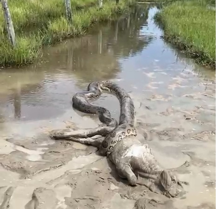 ABRAÇO DA MORTE: sucuri é flagrada “abraçando” bezerro em córrego; Vídeo