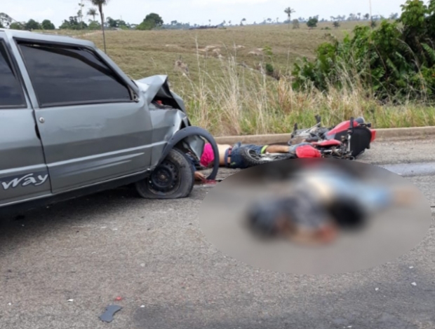 O acidente foi registrado no inÃcio da tarde deste sábado (15), na rodovia MT-206, envolvendo um veÃculo Fiat Uno e uma motocicleta Honda Bros. O casal que ocupava a motocicleta foi a óbito no local.