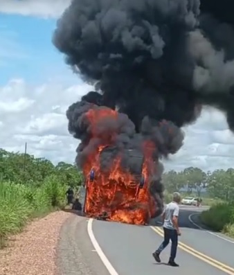 Um motociclista morreu e outros 16 passageiros ficaram feridos, nesta quinta-feira (23), após um acidente com um ônibus, na MT-010, próximo ao município de Rosário Oeste, a 133 km de Cuiabá. Após a batida, o veículo pegou fogo e ficou completamente destruído. Um vídeo gravado por pessoas que estavam no local mostram o ônibus em chamas. (veja acima)