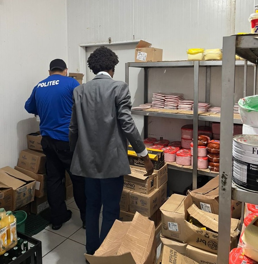 Durante a fiscalização, foram encontrados produtos com prazo de validade vencido, incluindo carnes, frios e produtos secos, expostos à venda e impróprios para o consumo humano.