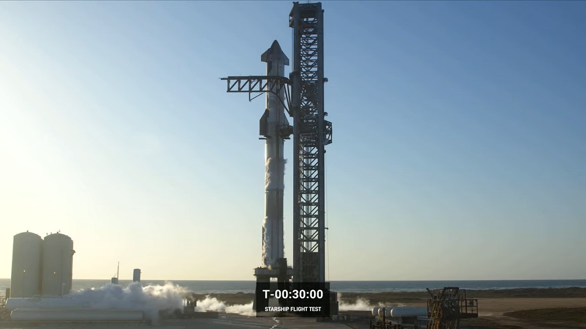 Com 120 metros de altura, o maior veículo espacial já construído na história da humanidade – e o mais poderoso de todos os tempos – estava posicionado em uma plataforma na Starbase, a base de lançamento da empresa em Boca Chica, no Texas, quando a contagem regressiva foi interrompida, a apenas 40 segundos da decolagem.