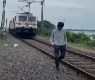 Na filmagem, é possível ver o jovem caminhando ao longo da linha férrea. Ao fundo, um trem dispara na direção de Ch Akshay Raj.