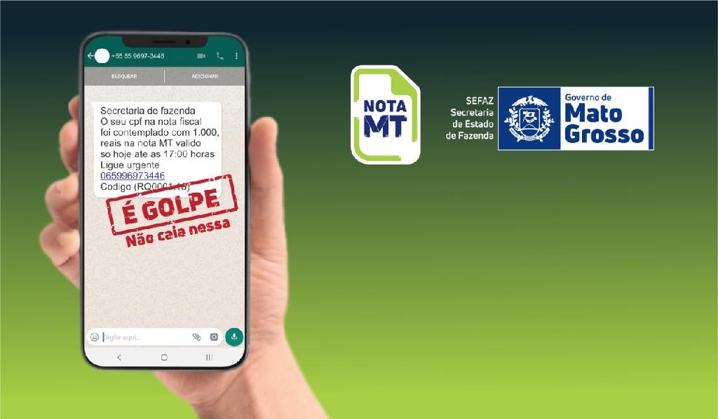 A Secretaria da Fazenda (Sefaz) informa aos consumidores que não envia e nunca enviou mensagens de texto para celulares (SMS) ou whatsapp aos sorteados do Programa Nota MT. Caso você receba esse tipo de contato, não ligue para o telefone indicado, não faça pagamentos e não forneça dados pessoais pois trata-se de uma tentativa de golpe.