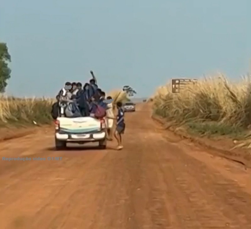 Um vídeo registrado nesta segunda-feira (12), mostra o momento em que alunos de uma escola estadual da comunidade Coqueiral, em Nobres, a 151 km de Cuiabá, são transportados na carroceria de uma caminhonete da prefeitura do município (veja acima).