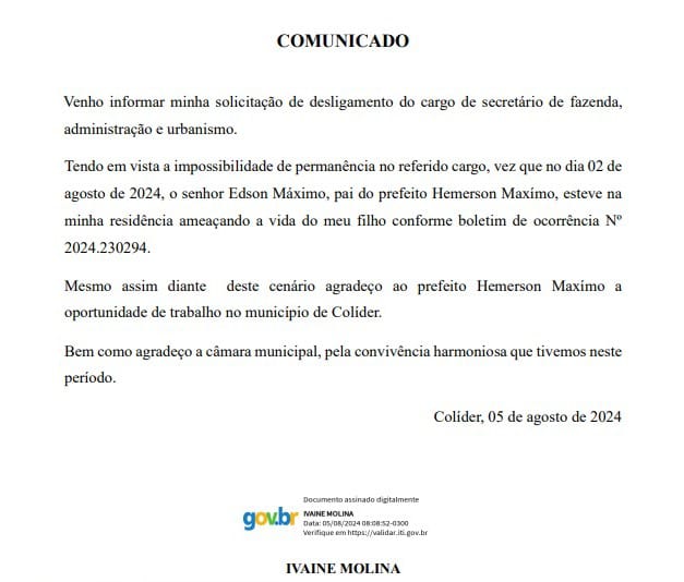 Início Policial AMEAÇA DE MORTE: Prefeitura Municipal de Colider Perde Mais Um dos Seus... NotíciasPolicial AMEAÇA DE MORTE: Prefeitura Municipal de Colider Perde Mais Um dos Seus Secretários. Veja BO Por Folha de Colíder - 6 de agosto de 2024 184 0 FacebookTwitterPinterestWhatsApp