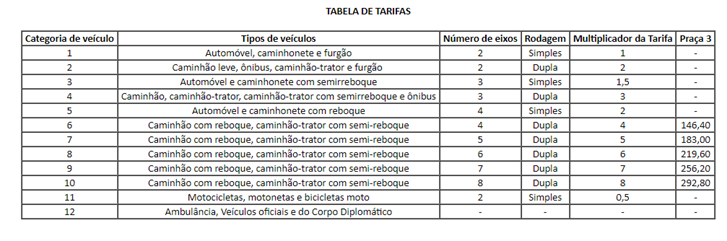 “Importante ressaltar que, especificamente em relação à praça de pedágio P3, serão isentos do pagamento de tarifa os veículos das categorias 1 a 5 e 11, sendo tarifado apenas os caminhões com quatro eixos ou mais e rodagem dupla, ou seja, motocicletas, carros, caminhonetes, furgões, caminhões leves, ônibus, caminhões com até 4 eixos de rodagem simples estão isentos da tarifa desta praça, conforme tabela abaixo”, informou a Agência.