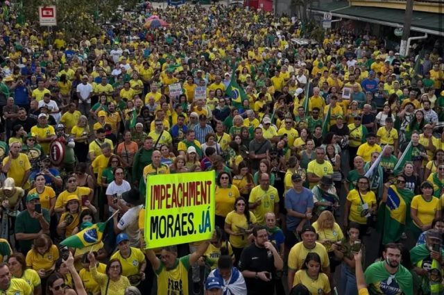 Apoiadores do ex-presidente Jair Bolsonaro (PL) realizaram uma manifestação neste domingo (3), na Praça 8 de Abril, região central de Cuiabá. O ato reuniu cerca de 4 mil pessoas, segundo a Polícia Militar, e fez parte de uma mobilização nacional com críticas ao Supremo Tribunal Federal (STF), defesa da anistia aos envolvidos nos ataques de 8 de janeiro e pedidos de saída do presidente Lula (PT).