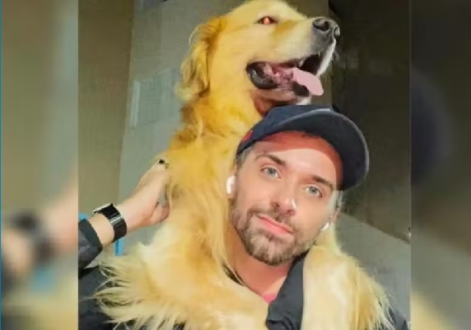Joca, o cachorro golden de 4 anos que morreu após ser transportado em voo errado da Gol, em cima do tutor João Fantazzini – Foto: reprodução / redes sociais