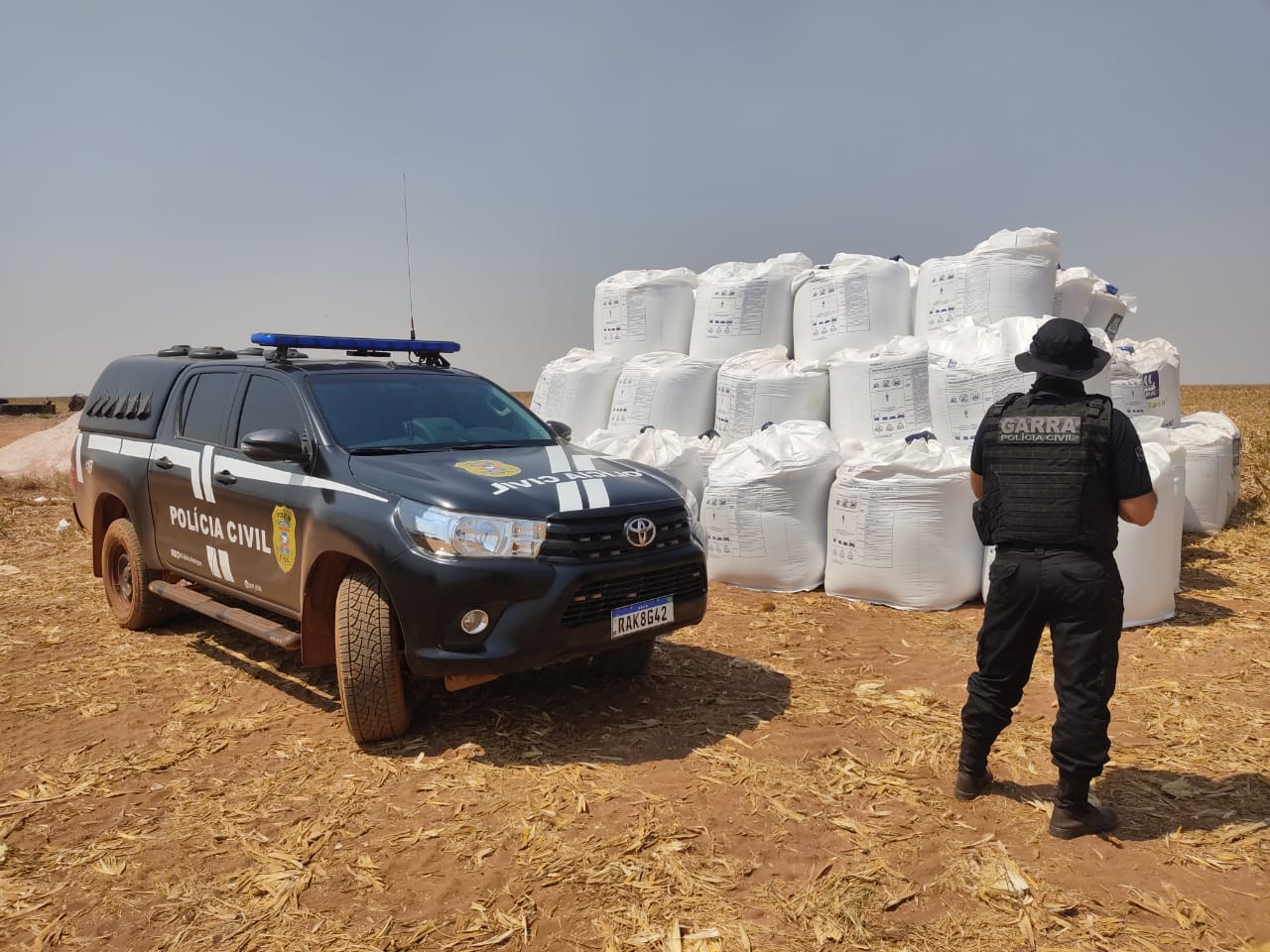 Logo após a apreensão de um caminhão Volvo engatado em dois semirreboques carregados com 37 toneladas de fertilizantes adulterados, os policiais civis conseguiram na mesma propriedade agrícola localizar mais 37 toneladas do mesmo produto.