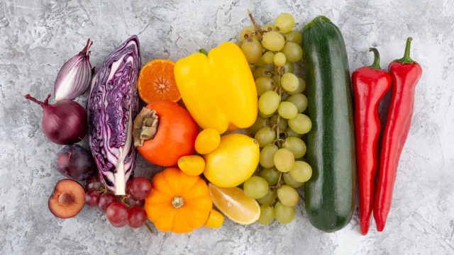 mesa com alguns vegetais, como repolho, caqui, uva, limão, pepino