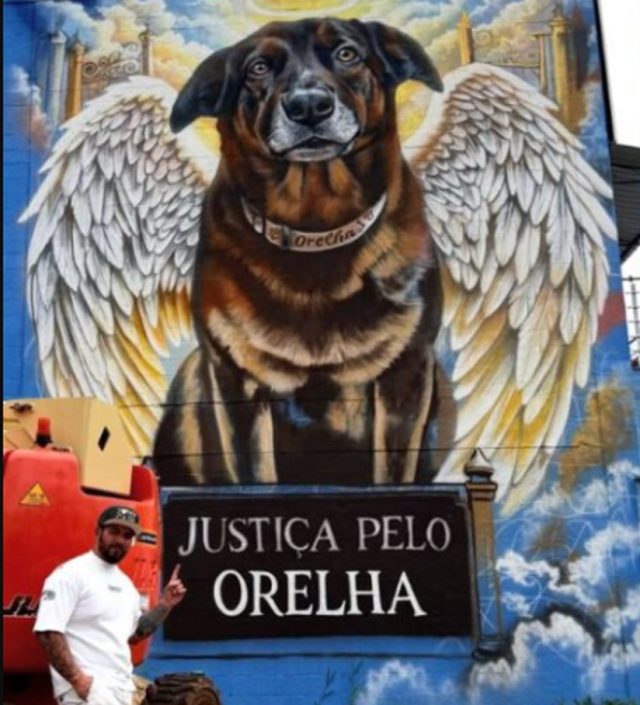 É um mural tão alto que Fábio Gomes Trindade precisou usar um guindaste para concluir a homenagem. Nela, o Orelha aparece com asas de anjo, chegando ao céu, uma coleira com o nome dele e uma mensagem: “Justiça pelo Orelha”.