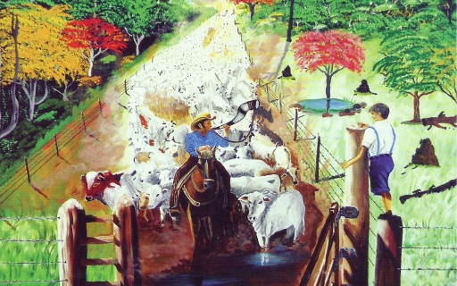 Com o seguimento neoprimitivista, o artista busca retratar nos seus quadros a conexão das composições musicais com o cenário bucólico e simplista do homem pantaneiro.