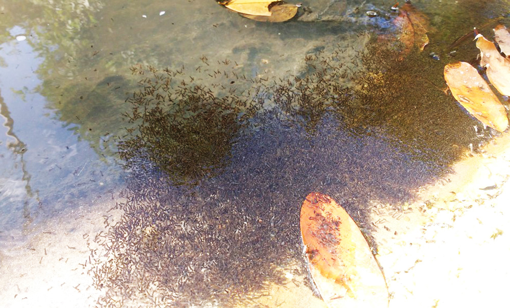 Devido as chuvas  fortes, muito lixo é carregado para dentro do leito do córrego, troncos de  árvores e o próprio lixo acabam deixando o córrego  represado em alguns pontos. Nestes pontos de água pouco corrente é possÃvel ver “milhões† de larvas de mosquitos, bem como muitos mosquitos voando nas proximidades.
