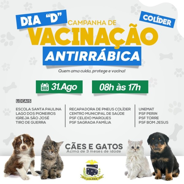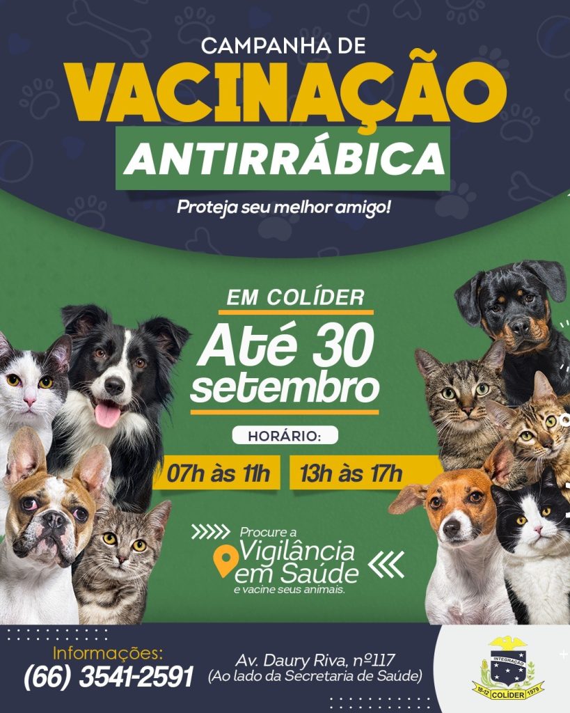 Ao vacinar seus animais de estimação, você não só protege a vida deles, mas também a sua e a de toda a comunidade. Não deixe para depois! Participe da campanha de vacinação e ajude a manter Colider livre da raiva.