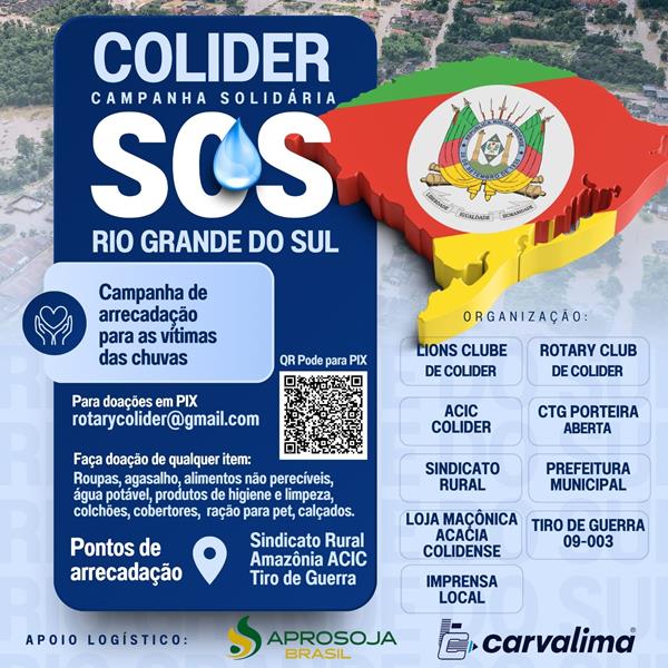 Os Organizadores da Mobilização SOS Rio Grande do Sul, de Colider, formada pela União de esforços de segmentos organizados no sentido de arrecadar DONATIVOS a serem encaminhados às vítimas da Tragédia do Rio Grande do Sul, estão precisando com urgência de VOLUNTÁRIOS para ajudar na seleção e empacotamento dos preciosos produtos.