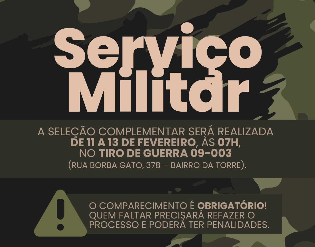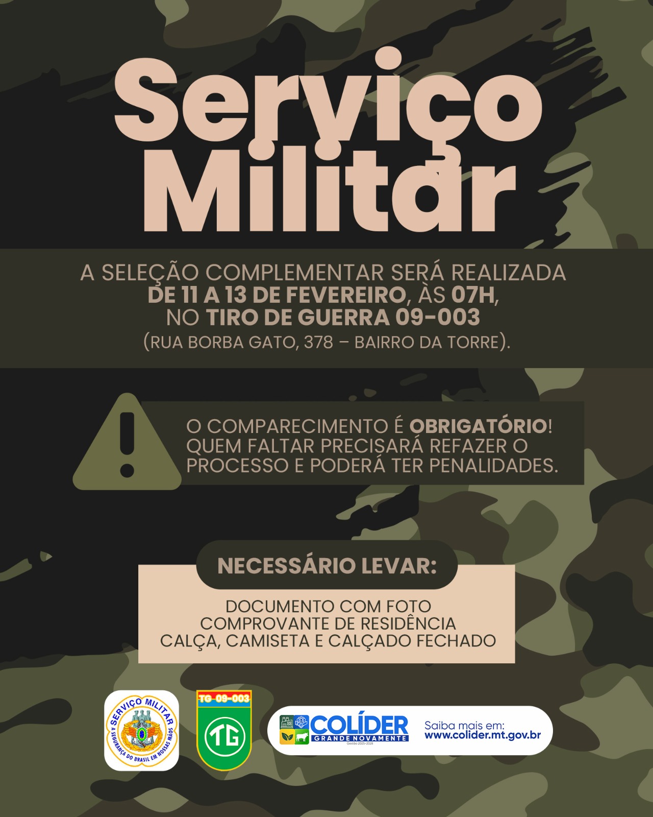 A 12ª Delegacia de Serviço Militar, sediada em Colíder, informa, aos jovens designados para o serviço militar, que deverão se apresentar para a Seleção Complementar, prevista para ocorrer no período de 11 a 13 de fevereiro de 2025, às 07:00h, no Tiro de Guerra 09-003, localizado na Rua Borba Gato, nº 378, Bairro da Torre, Colíder (mesmo endereço da primeira apresentação).