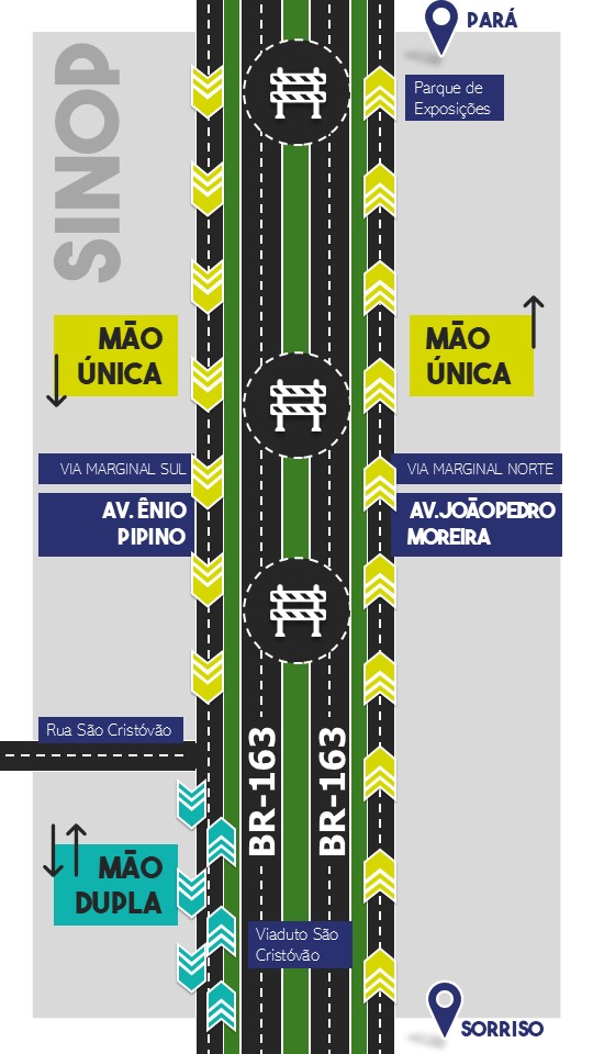 Quem trafega pela avenida João Pedro Moreira (via marginal norte da BR-163) precisa ficar atento, visto que o fluxo seguirá somente no sentido norte (Sorriso/Pará) em todo o segmento do km 830 ao km 839, ou seja do viaduto São Cristóvão ao viaduto em construção na BR-163, próximo à avenida Jonas Pinheiro.