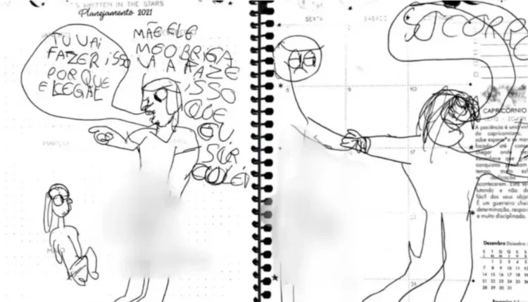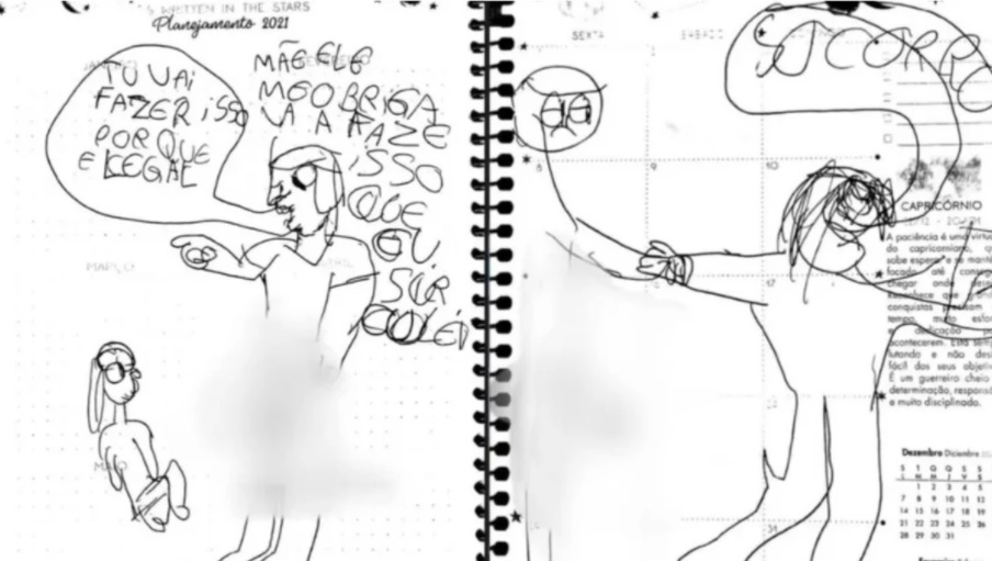 As imagens desenhadas pelas meninas têm cunho sexual e foram encontradas em um caderno, que havia sido presenteado pela avó materna das crianças. Os desenhos foram divulgadas pela Polícia Civil.