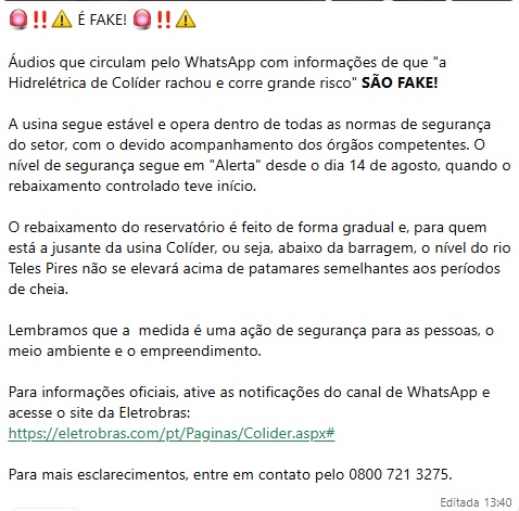 No ínício desta semana omeçarem a circular áudios no WhatsApp com a falsa notícia de que a barragem da usina hidrelétrica Colider havia se rompido e que a região corria risco iminente de inundação, informação essa que foi desmentida pela Eletrobras, concessionária responsável pela operação da usina, que classificou o conteúdo como fake news.