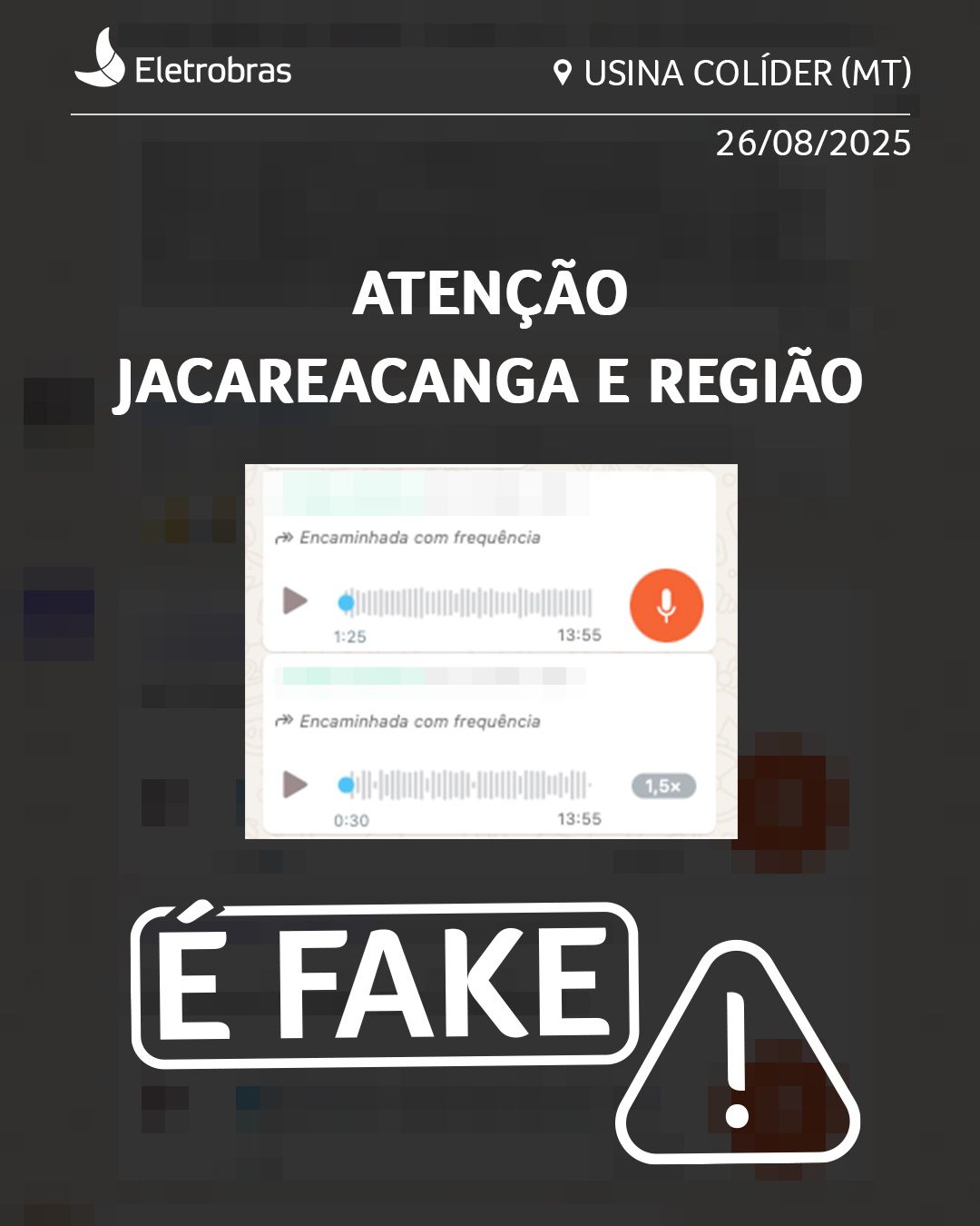 No áudio que circulou pelas redes sociais, uma pessoa, se passando por funcionária da Eletrobras, afirmava que a “hidrelétrica de Colíder rachou e corre grande risco”. A mensagem se espalhou rapidamente, gerando apreensão na população e até mesmo boatos sobre evacuação de áreas próximas.