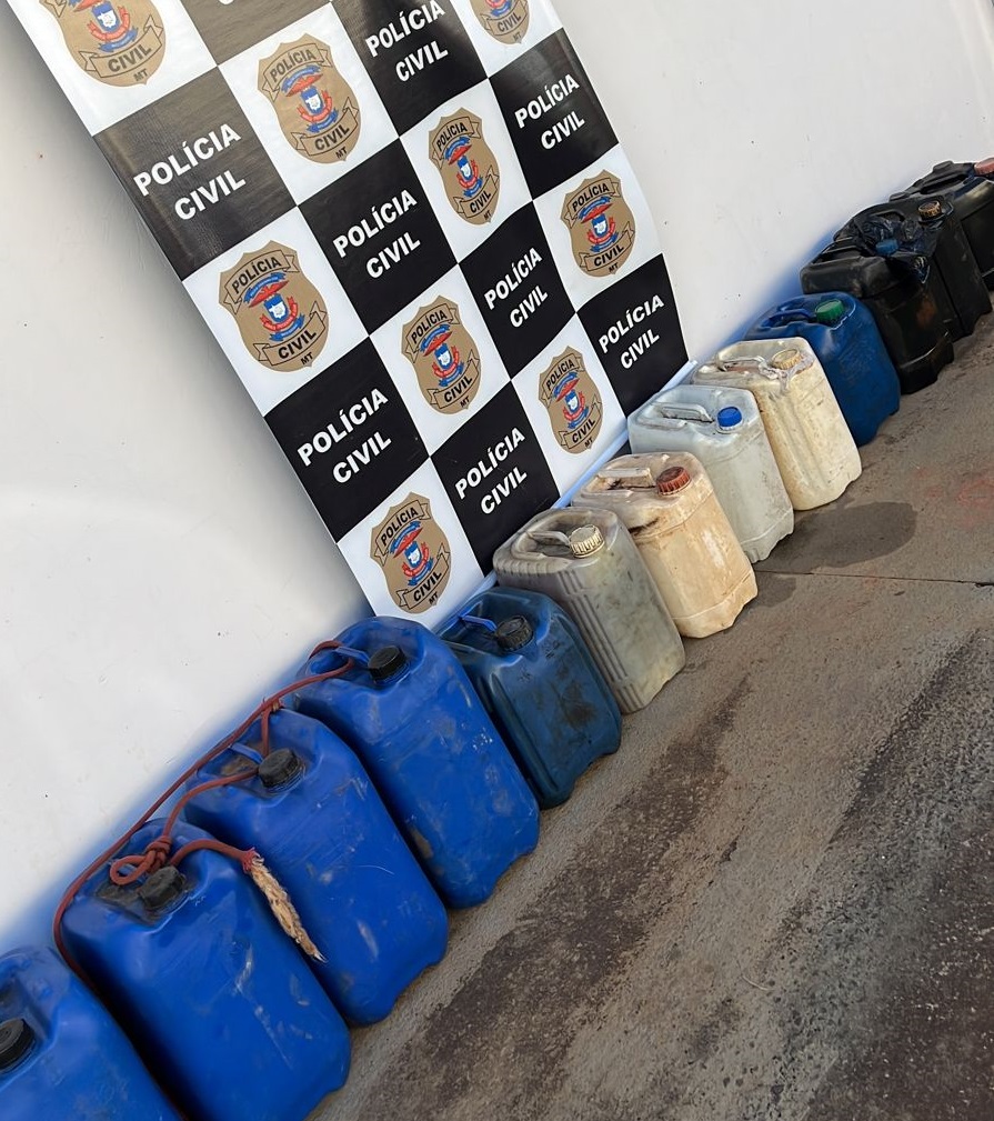 A ação resultou também na apreensão de treze tambores, sendo nove deles contendo litros de óleo diesel. O homem de 22 anos foi autuado em flagrante por furto.