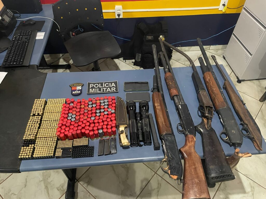 Ainda conforme o registro dos militares, foram recuperadas cinco espingardas, sendo quatro calibre 12 e uma 22, e mais de 700 munições de diversos calibres, que haviam sido furtadas da fazenda.