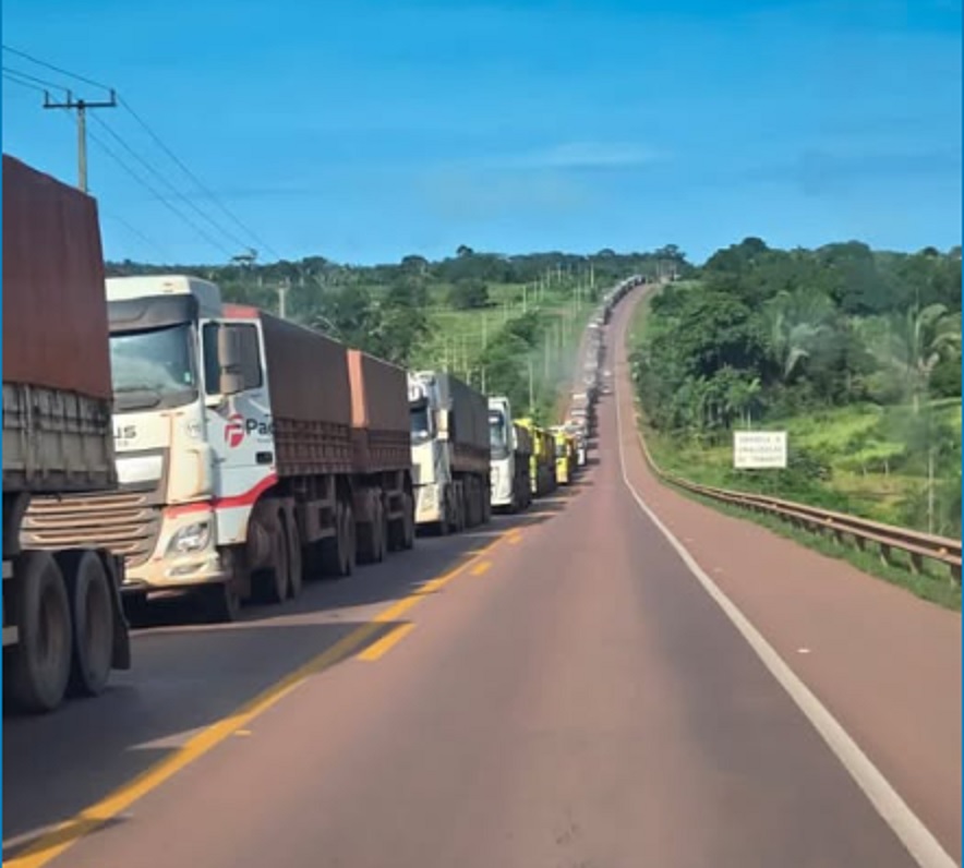 A BR-230, entre KM 30 e Miritituba, em Itaituba, no Pará, enfrenta um bloqueio que já dura nove dias, sem previsão de normalização do trânsito
