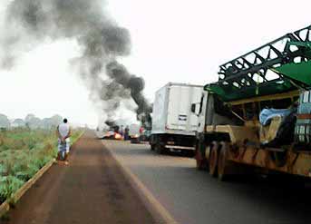 Manifestantes impedem a passagem de caminhões com carga seca.