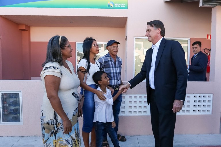 O presidente Jair Bolsonaro participou, hoje (24), da cerimônia de entrega de 472 imóveis em um conjunto habitacional do programa Minha Casa, Minha Vida, em Petrolina (PE), que servirão de moradia própria para cerca de 2 mil pessoas. Foi a primeira viagem do presidente ao Nordeste desde que tomou posse. Pela manhã, ele se reuniu com os governadores da região no Recife.