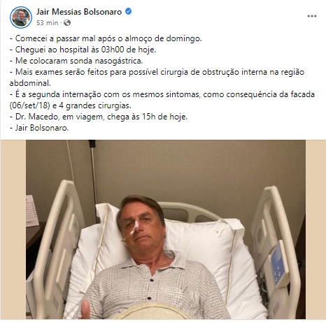 O médico Antônio Luiz Macedo, que operou o presidente devido à facada que recebeu em 2018, passava férias nas Bahamas e espera voo de volta ao Brasil para acompanhar de perto a situação. Desta vez, Bolsonaro pode ser submetido a uma nova cirurgia.