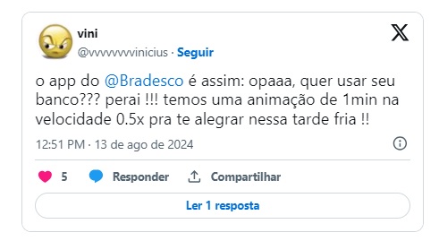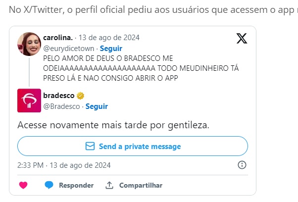 No X (antigo Twitter), clientes do Bradesco relataram lentidão na hora de acessar o aplicativo e mensagens de erro na aba do Pix, impossibilitando a realização das transações.