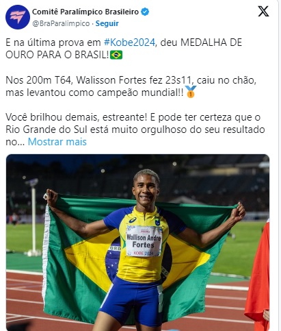 O Brasil encerrou, na manhã deste sábado (25) no estádio Kobe Universiade Memorial Stadium, o Mundial de atletismo paralímpico com a conquista de mais seis medalhas, com destaque para o ouro alcançado pelo gaúcho Wallison Fortes na prova dos 200 metros T64 (para amputados de membros inferiores com prótese).