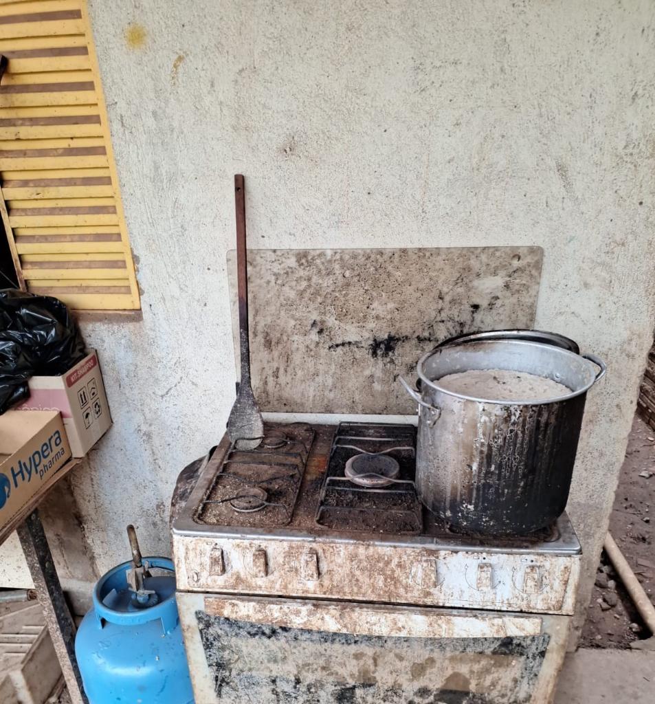 Foram encontrados restos de comida em cima do fogão, uma sacola com restos de carne putrefata na geladeira que estava desligada, devido a falta de energia na casa. O quintal encontrava-se completamente sujo, com muito entulho e dejetos deixados pelo proprietário, e dentro das baias havia urina e fezes.