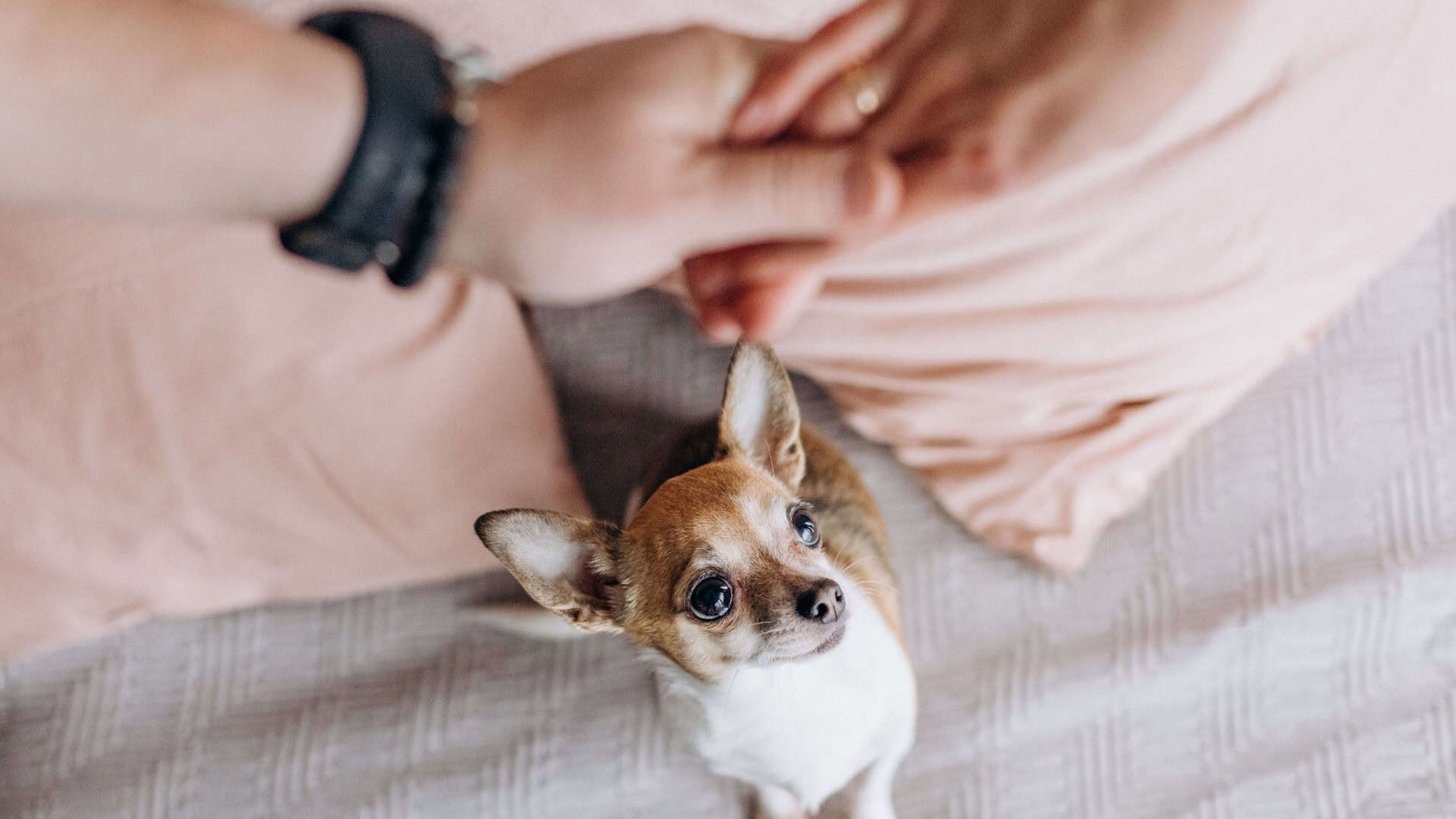Um cão pequeno observa atentamente duas mãos entrelaçadas, em um ambiente acolhedor com almofadas ao fundo. A cena sugere conexão afetiva entre humanos e o olhar atento do animal.