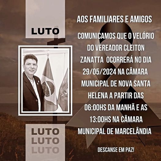 Faleceu no dia de ontem(28) o vereador Cleyton Zanatta (PSDB), de Nova Santa Helena, Nortão do Estado de MT, em decorrência de um câncer.