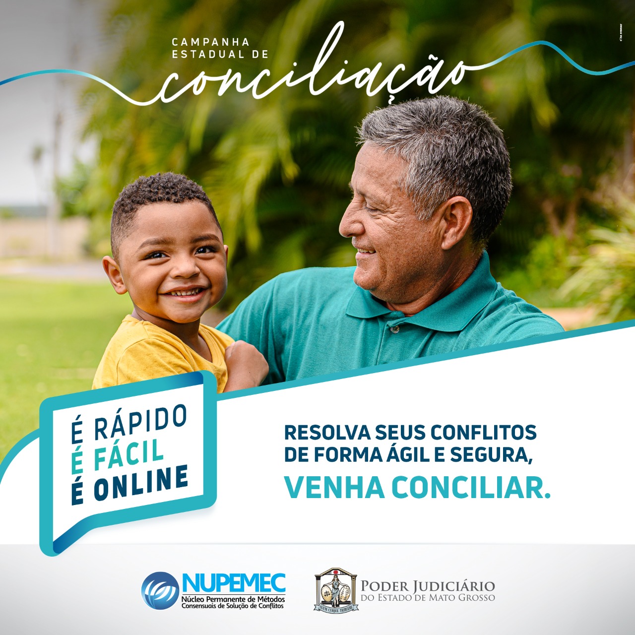 Descrição de imagem: Foto1: Arte da Campanha Estadual de Conciliação que mostra um senhor, com camisa polo verde ao lado de uma criança com camiseta amarela. Ele olha para o menino com carinho e a criança com sorriso no rosto. Eles estão em local aberto, com árvores ao fundo. Na arte, acima dos dois, está escrito: Campanha Estadual de Conciliação. Abaixo deles, em forma de arte, estão as frases da campanha. Do lado esquerdo: “É fácil, é rápido, é online. Do lado direito: “Resolva seus conflitos de forma segura, venha conciliar”. E abaixo das frases, as logomarcas do Nupemec e do Poder Judiciário de Mato Grosso.