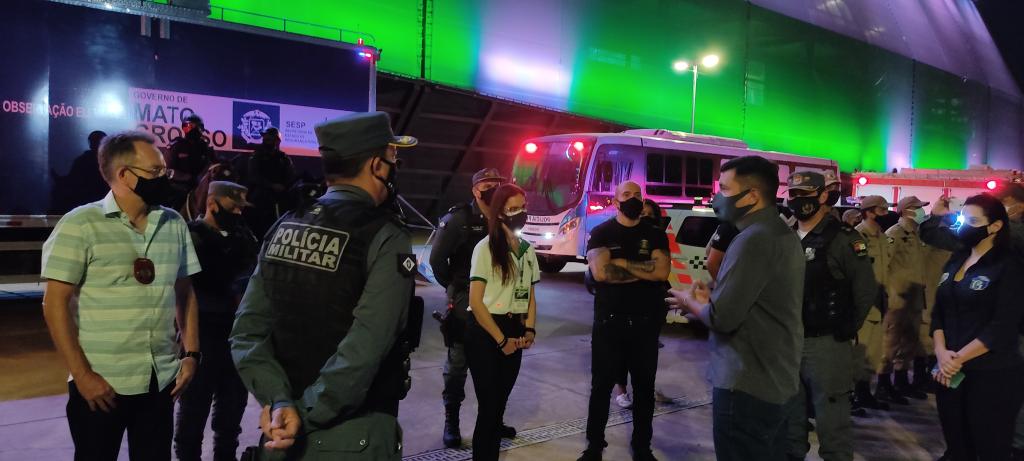 O exame de corpo delito é feito na própria Arena Pantanal, em uma unidade móvel do Instituto Médico Legal (IML) e a custódia dos presos é feito em um ônibus do Sistema Penitenciário, em que os policiais penais do Serviço de Operações Especiais (SOE) fazem a guarda.