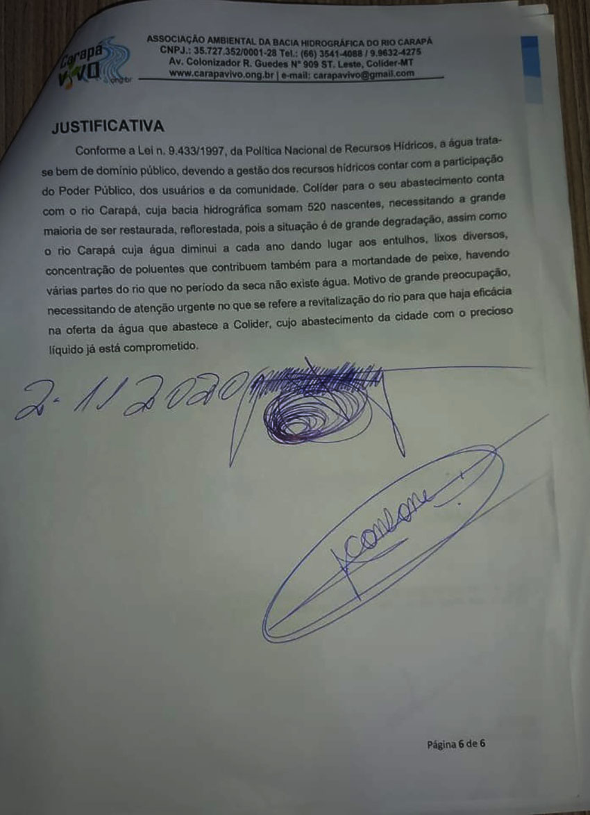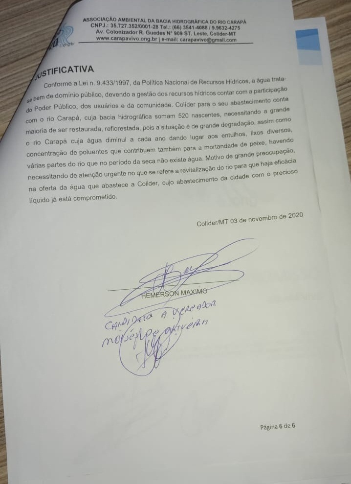 Três dos quatro postulantes ao cargo de prefeito de Colíder, nas eleições municipais deste ano, Noboru Tomiyoshi, Jaime Marques Gonçalves e Hemerson Máximo, assinaram “Termo Compromisso” da Associação Ambiental da Bacia Hidrográfica do Rio Carapá (CARAPÁ VIVO), cujo membros se reuniram com os referidos candidatos, seus vices e alguns candidatos a vereador, os quais também afiançaram o compromisso. Quanto ao candidato Osmar Serafini vários contatos foram feitos com ele e assessores na tentativa de reunir com o mesmo, mas sem sucesso.