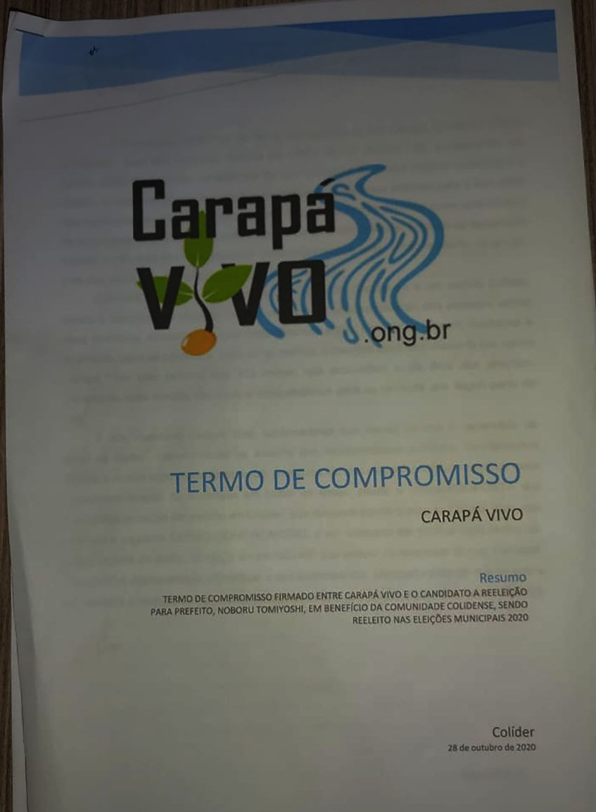 “Eleger prefeito realmente comprometido com a gestão pública do meio ambiente é passo muito importante a ser dado pela comunidade, para a qual Carapá Vivo propõe divulgar anualmente as ações que o candidato eleito desenvolver voltadas ao proposto no “Termo Compromisso” assinado”, salienta o presidente Eliel Motta.