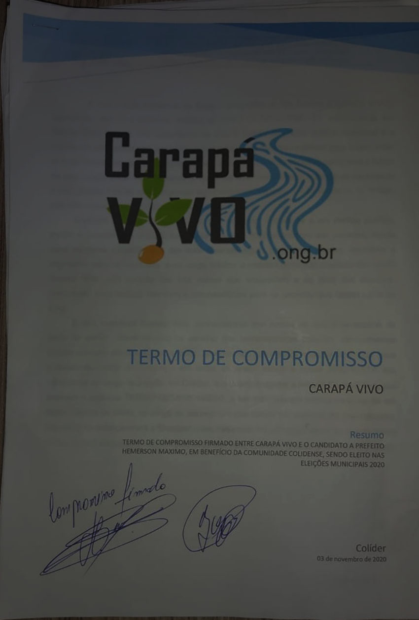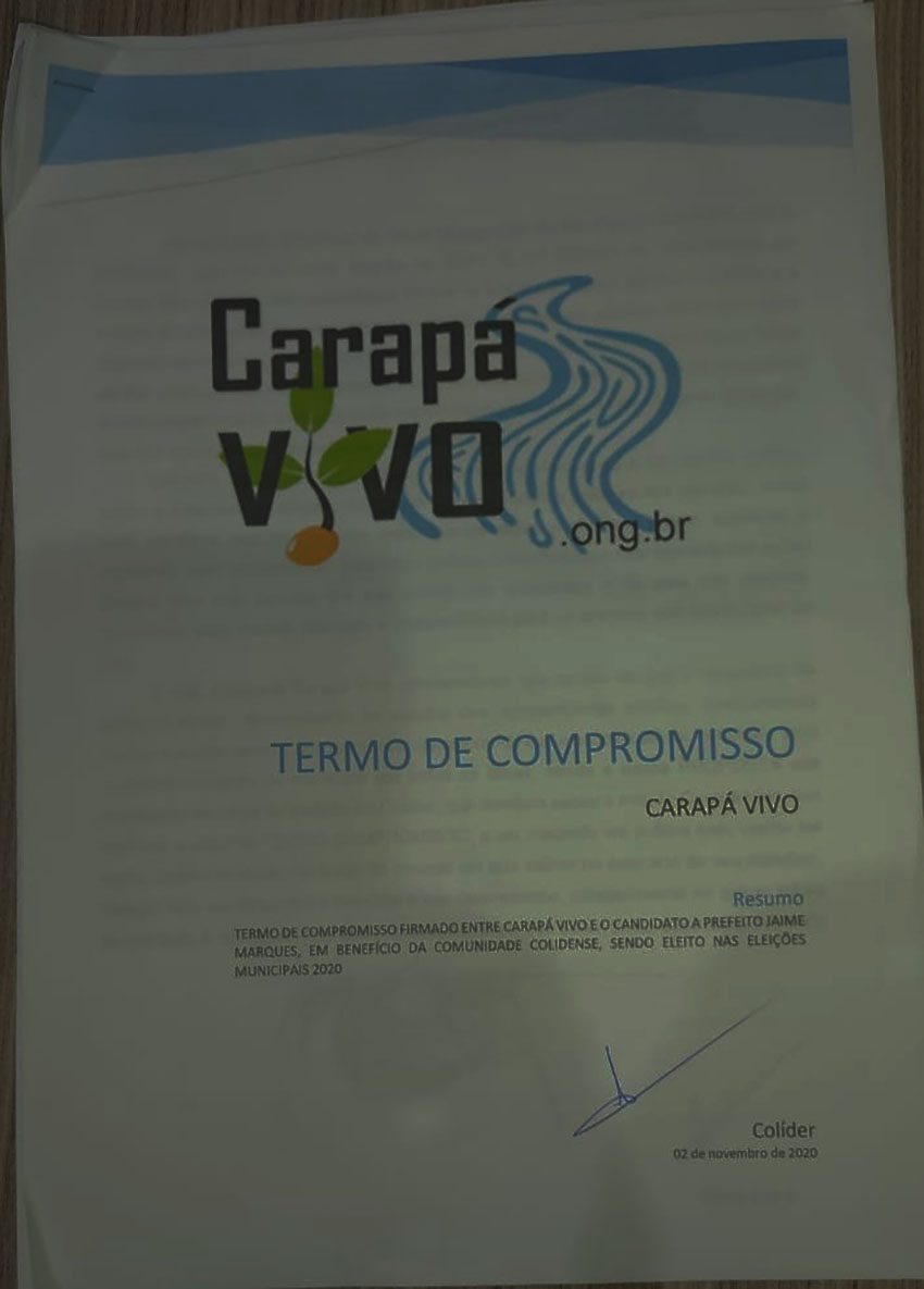 A adesão dos candidatos a Carta Compromisso assinala o comprometimento, sendo eleito, com a boa gestão da Política Pública Ambiental, promovendo o desenvolvimento de ações que sanam problemas ambientais que afetam a sociedade, realizando parceria com Carapá Vivo no sentido de desenvolver ações ambientais voltadas a Defesa, Proteção e Preservação do meio ambiente, atendendo, assim, demandas importantes para a sociedade, como a Revitalização do rio Carapá, garantindo vida ao rio e agua de qualidade à comunidade.