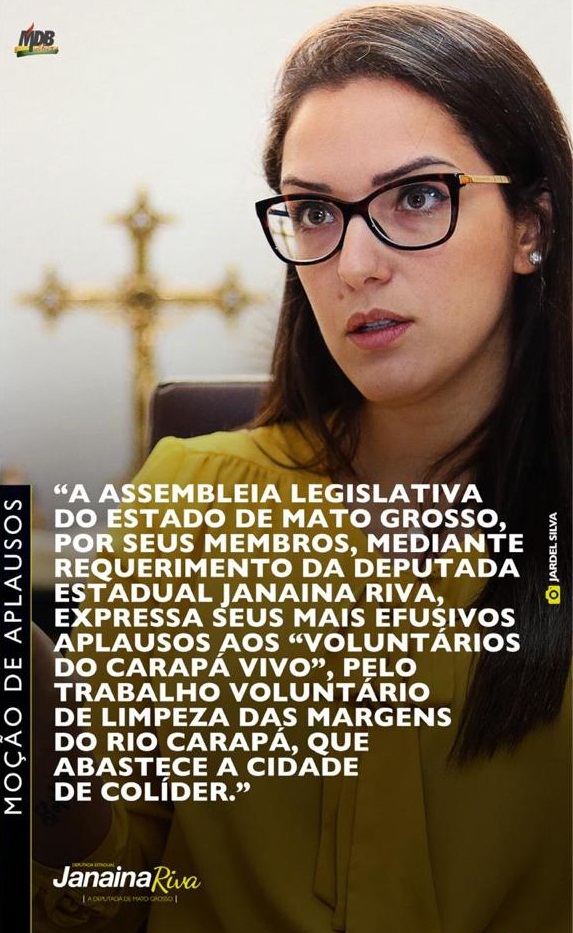 A Deputada Estadual Janaina Riva, expressa seus APLAUSOS aos “Voluntários do Carapá Vivo”, por meio da Moção de Aplausos Nº 1435/2020, aprovada em 25 de novembro último, pelo trabalho voluntário de limpeza das margens do Rio Carapá, que abastece a cidade de Colíder.”
