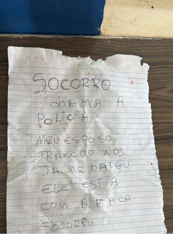 Os policiais militares foram acionados para atenderem a uma ocorrência de possível sequestro em uma residência no bairro Vida Nova II. No local, os militares encontraram um bilhete com a seguinte mensagem: “Socorro, chama a polícia. Meu esposo nos trancou e já me bateu. Ele está com uma faca. Socorro”.