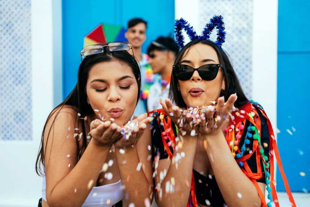 Mulheres soprando confete nas ruas durante o Carnaval (Imagem: Kleber Cordeiro/Shutterstock)