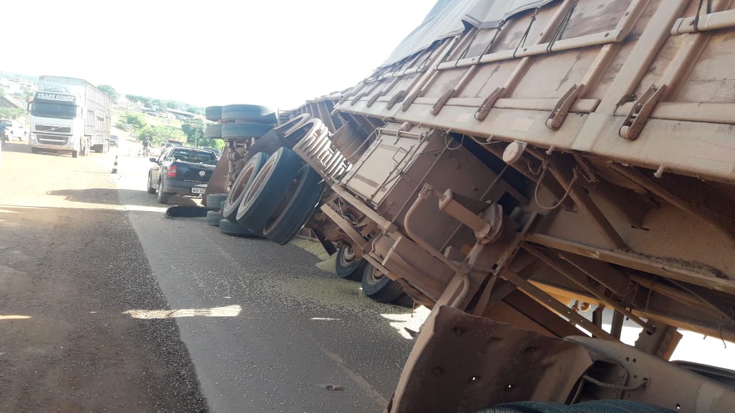 b89c8421-65e7-4560-8314-56a0a1dad228         Na manhã desta sexta-feira(22) o transito em meia pista sendo controlado  com o apoio da  Guarda Municipal, enquanto outras providências são tomadas para a retirada da carreta e do produto que espalho por vários metros na pista.